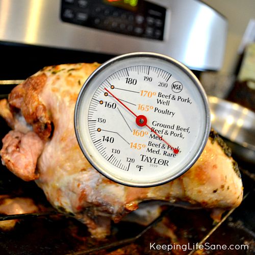 Now you’ll need to use about half the herbs under the skin of of the turkey. You will need to just pull the skin back and rub it on and then lay the skin back on. Rub the rest all over the outside. Pour 1 cup of chicken broth or wine into the bottom of your pan. I love that is has one of those thermometers that pop out when it’s done!