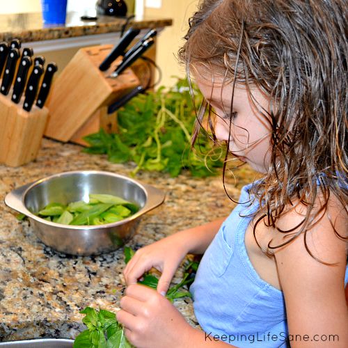 First, you’ll need to preheat the oven to 325F. I grabbed the basil from my garden and had my helper pick the leaves off for me. I had her do about 1 cup of leaves.