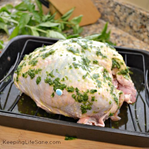 - Place turkey in roasting pan and pull back the skin on the turkey breast and rub on half the basil mixture. Replace the skin and rub the other half of the basil on the outside.